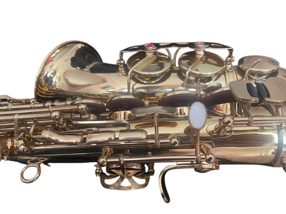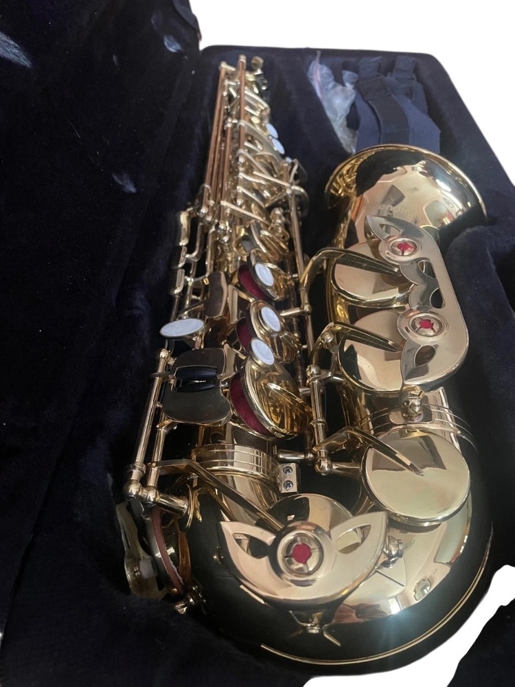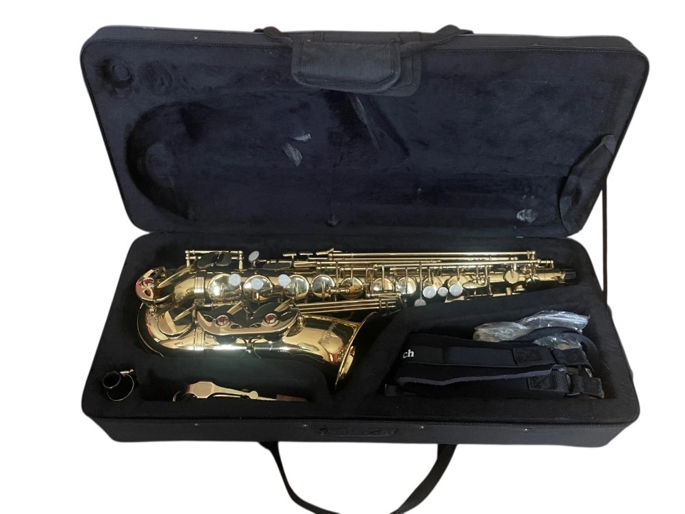 The Cecilio Mendini Alto Saxophone comes in a durable case for secure storage and transportation. It's a quality musical instrument ideal for beginners and intermediate players, providing rich sound. The package includes a mouthpiece, pair of gloves, cleaning cloth, and a neck strap for complete playing experience.