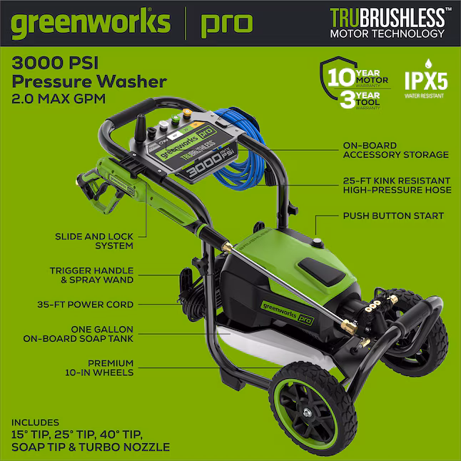 The Greenworks Pro GPW3000 is a brand new, unused pressure washer still in box. It boasts a powerful 3000 PSI capacity, ideal for heavy-duty cleaning tasks. This professional-grade equipment offers impressive power and performance for your cleaning needs.
