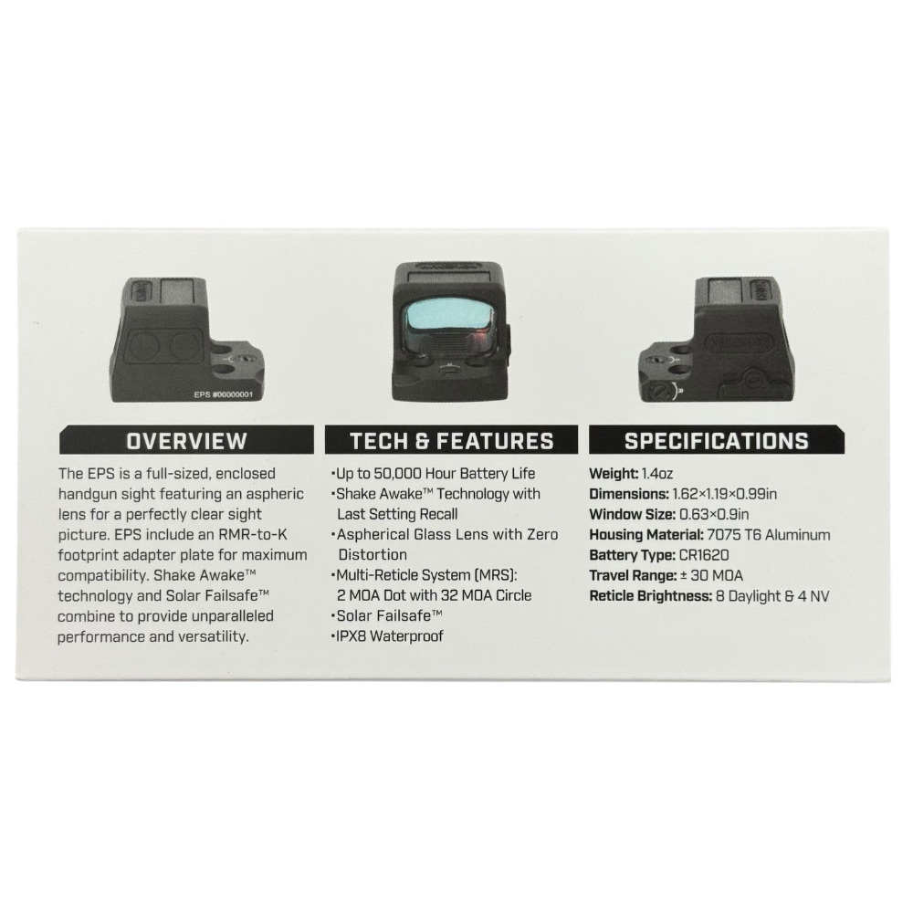 The EPS-GR-MRS is a full-sized, enclosed handgun sight featuring an aspheric lens for a perfectly clear sight picture. EPS-GR-MRS has an ultra-low dot height for compatibility with most factory iron sights and utilizes Holosun’s proven K footprint. EPS-GR-MRS includes an RMR-to-EPS footprint adapter plate for maximum compatibility.