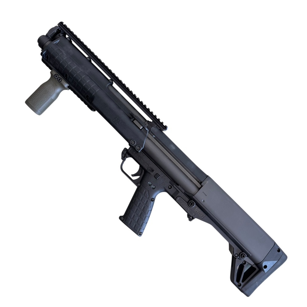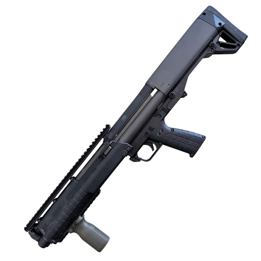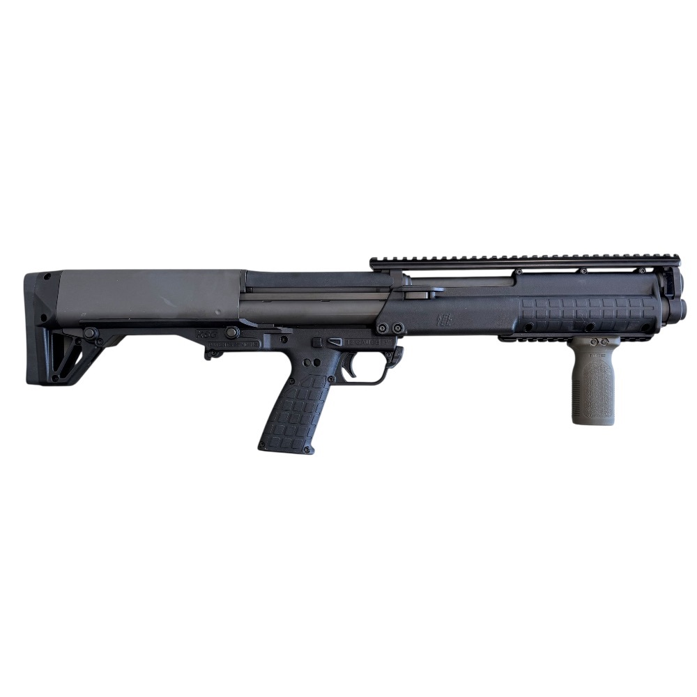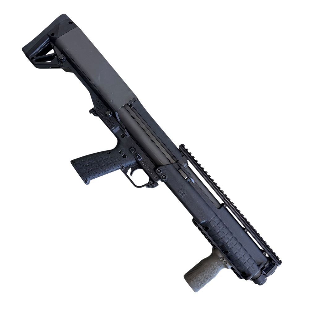 The Keltec KSG is a compact 12 Gauge pump shotgun with an 18.5-inch barrel. Offering dual tube magazines, it holds 14 rounds overall. With a shorter overall length than traditional shotguns, it excels in close quarters and home defense situations.