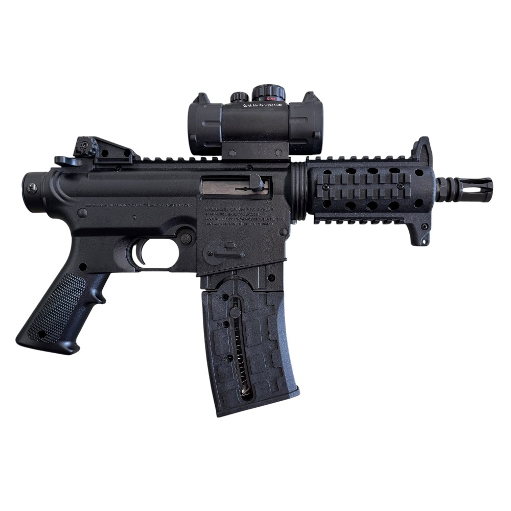 Mossberg 715P 22 Long Rifle 6in Black Modern Sporting Pistol - 25+1 Rounds - This fun .22 pistol is lightweight, easy to shoot, and perfect for small game, plinking, target shooting or clearing cottonmouths out of your duck blind. This pistol has a pistol grip stock, vented quad rail forend, and a 6", blued barrel with an A2-style muzzle brake. Includes a UTG-SCP-RD40RGW-A Red/Green Dot Optic.