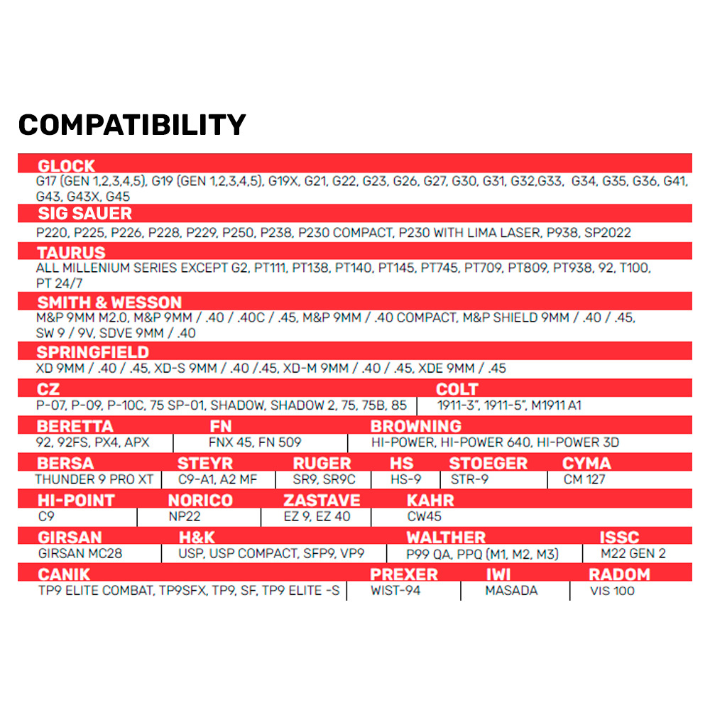 COMPATIBLE WITH: PISTOLS WITH 4″ TO 5″ BARRELS, BEST WITH 4.5″