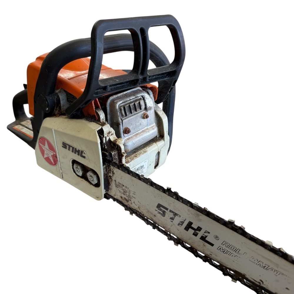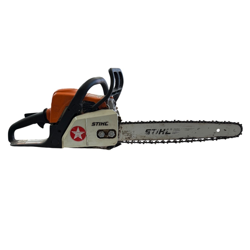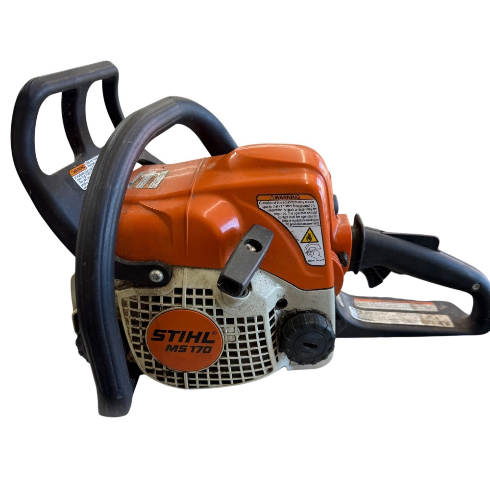 The Stihl MS170 is a lightweight, powerful gas chainsaw ideal for homeowners. Its features include a 30cc engine, 16 bar length, anti-vibration system, automatic chain oiler, and quick chain adjuster for easy maintenance and efficient cutting. Perfect for light firewood cutting and general yard tasks.