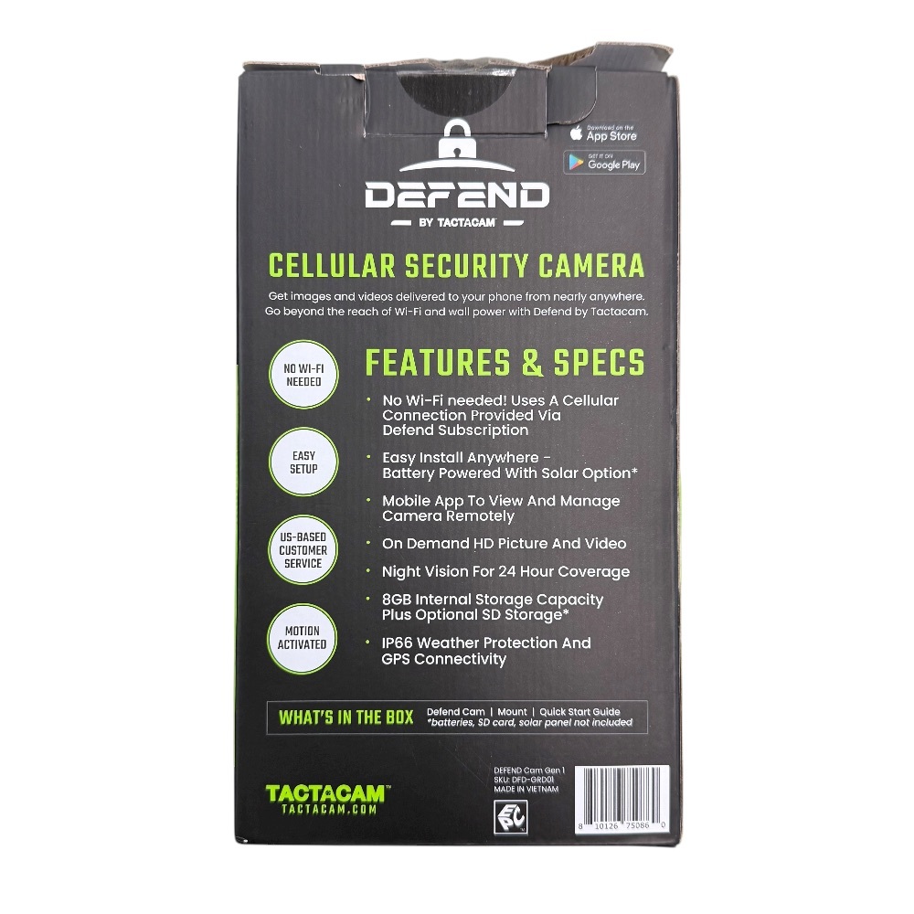 Brand new Tactacam Defend Cellular Security Camera, in unopened box. Features cellular connectivity for remote monitoring, rechargeable battery for extended use. Ideal for home security, wildlife observation, property surveillance. Easy installation, high-resolution footage, night vision-enabled. Secure your property smartly.